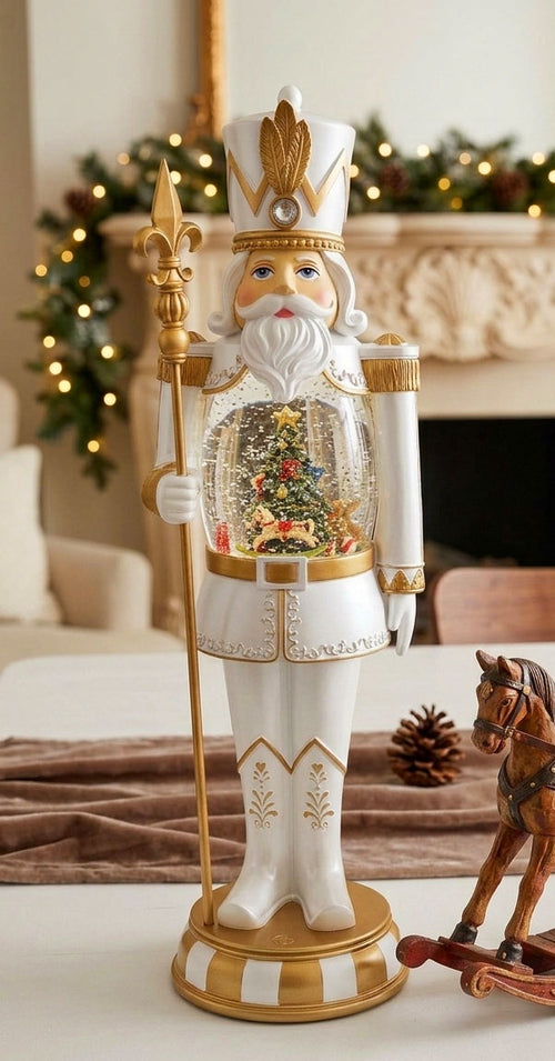 Elevate your holiday display with our stunning 19" White and Gold Nutcracker Statue Lighted Swirl Water Lantern—the must-have 2026 addition to any festive home. This elegant piece features a mesmerizing water globe center with animated figurines that bring timeless charm to life. The white finish with gleaming gold accents creates a sophisticated, refined look that complements any décor style. Watch as continuous swirling glitter dances inside the globe, creating a magical focal point. Easy touch on/off control on the base, plus battery or USB operation for flexible display options. A true holiday tradition reimagined for modern elegance.