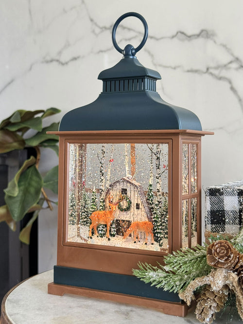 Introducing our exclusive Christmas Deer Scene Water Lantern. The perfect addition to your holiday decor, this two tone lantern features a serene scene of two deer in front of a barn in the woods. With a 6 hour timer and included USB cord, enjoy the swirling glitter and warm light all season long.