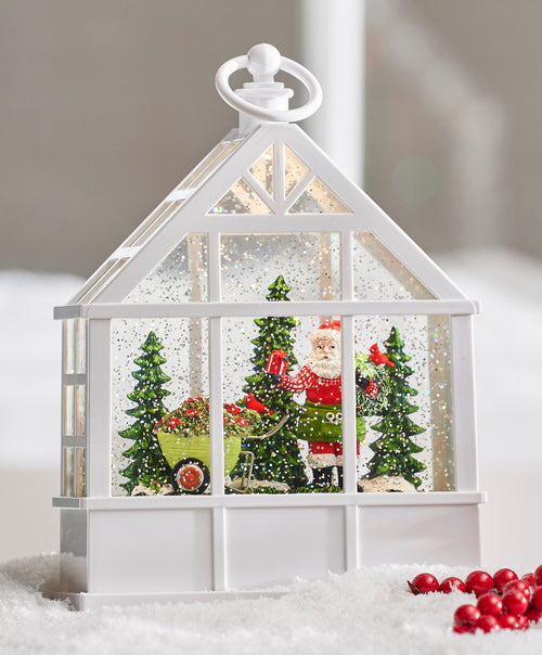 Bring some festive flair to your garden with this Gardening Santa Lighted Water Greenhouse! This 9.5 inch lantern features a jolly Santa tending to his flowers with a wheelbarrow, while sporting a garden apron adorned with Cardinals and evergreens. The perfect addition to your holiday decor!