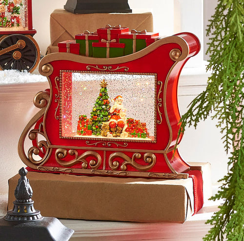 This is the sleigh ride of your winter dreams! A Musical Santa Checking His List Lighted Water Sleigh is here to bring some extra cheer! With a jolly ol' Saint Nick inside, surrounded by presents, inside a sleigh trimmed in cheerful red & gold, you'll be caroling along with its 8 classic Christmas tunes. USB included, get ready for a festive 2024!
