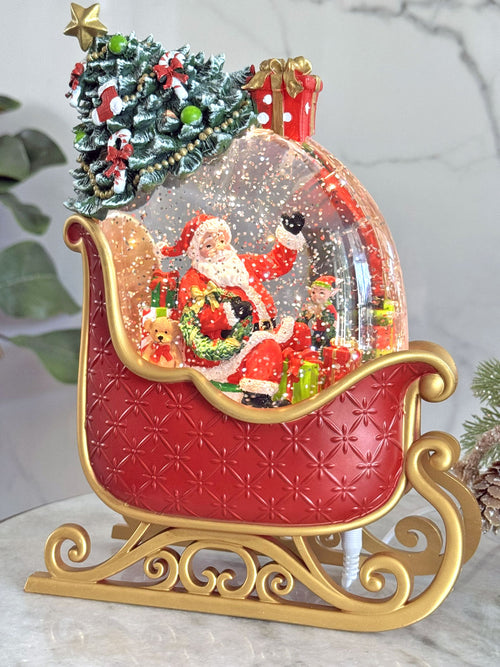 Experience the magic of Christmas with Santa's Sled Lighted Water Lantern. Watch as the swirling glitter inside creates a mesmerizing scene of Santa, an elf, and a sled filled with toys. Admire the beautifully decorated tree with a golden star on top. This limited edition lantern is sure to become a treasured piece for years to come. New 2024.