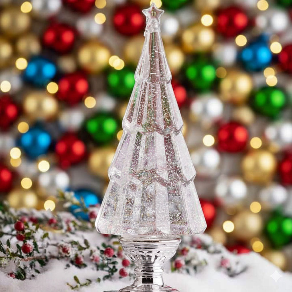 14 Inch Clear Acrylic Lighted Tree Water Lantern Snow Globe - Silver Base - 4219144