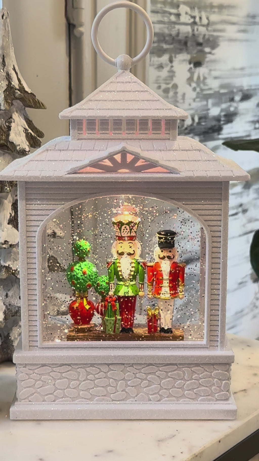 The 10.5" Nutcracker Topiary Lighted Water Lantern brings festive cheer with its vibrant Christmas red and green colors, surrounded by charming packages. USB-powered and featuring a timer option, this playful lantern adds a merry touch to your holiday decorations in 2025.