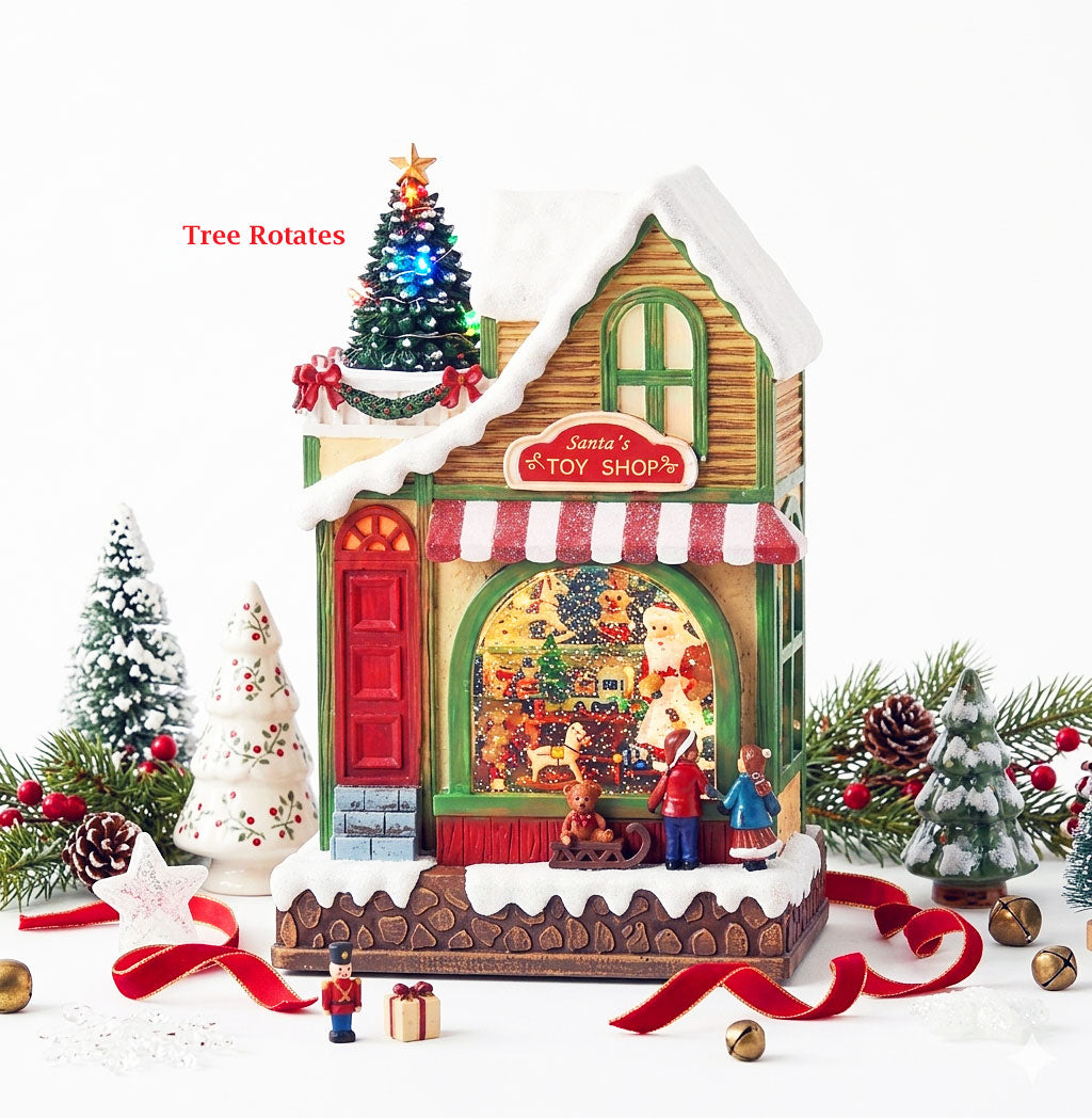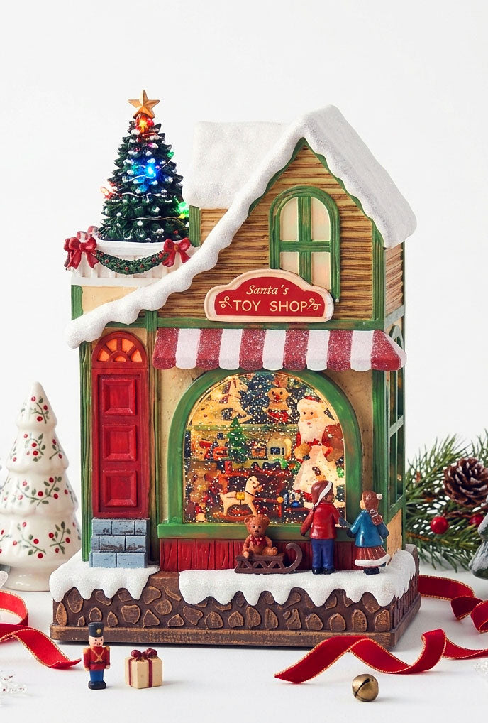 Step into Santa's magical toyshop with this enchanting lighted water lantern. Watch as Santa works tirelessly inside, crafting toys while children peer through the windows in wonder. The snow-capped roof sets a festive scene, at the top, a lighted Christmas tree rotates mesmerizingly, casting a warm glow throughout the display. Measures 11"H x 7.25"W x 5"L. Features continuous swirling glitter, powered by 3 x AA batteries (sold separately) or USB cord (included). New 2026 design.