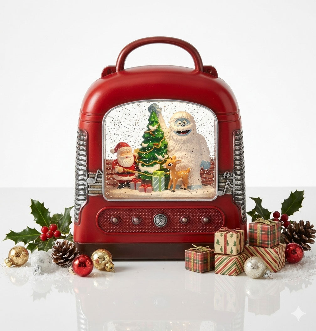 Vintage style radio featuring Rudolf, Santa, and Bumble comes to life with swirling glitter and magical music. Rudolf lighted water lantern plays "Rudolf the Red Nose Reindeer" and stands 7.75" tall. Watch the continuous snow globe swirl as the classic holiday tune plays. Powered by 3 x AA batteries (sold separately) or USB cord included. Perfect nostalgic holiday decor for collectors and families alike. New 2026 release.