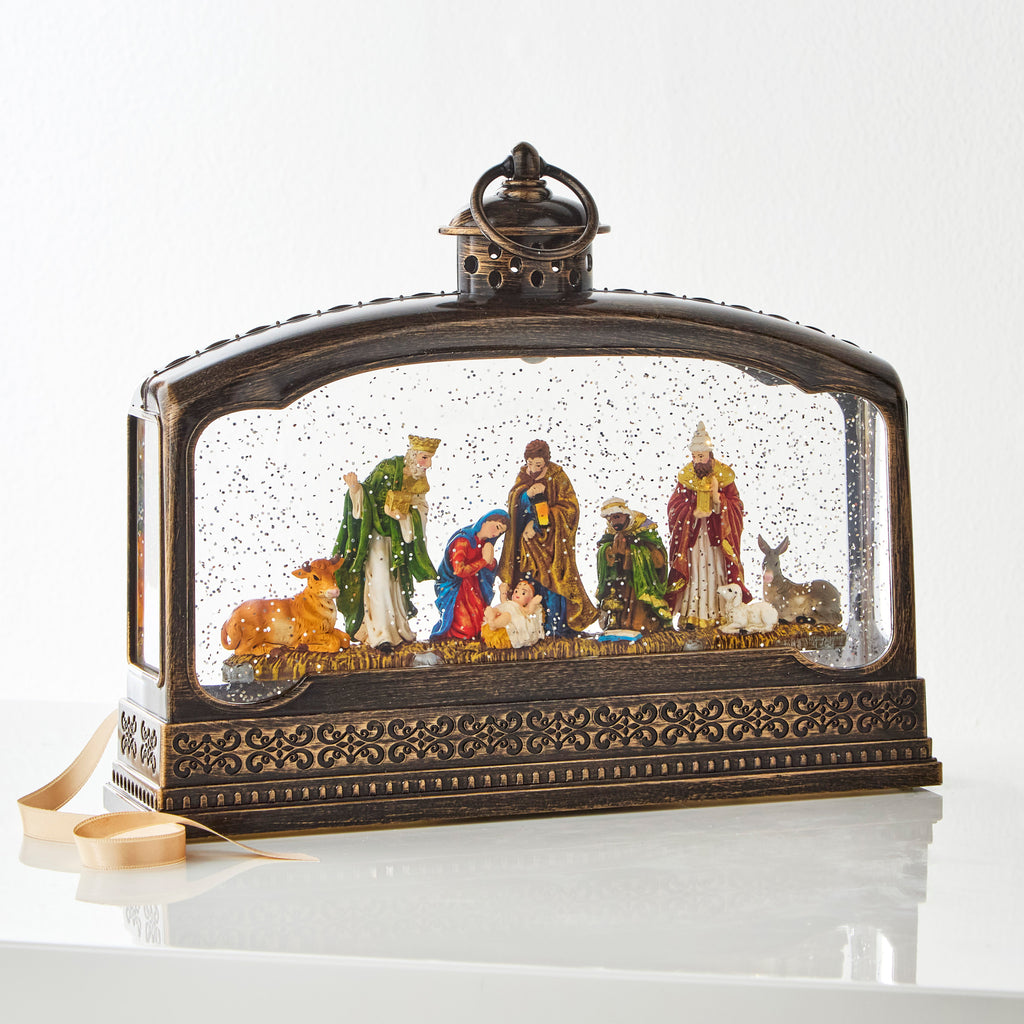 The 11.5" Nativity Lighted Water Terrarium snow globe in bronze offers a wide view of the traditional nativity scene, enhanced by swirling glitter that evokes a peaceful, spiritual atmosphere. Designed for 2025, this elegant lantern brings a meaningful glow to your holiday reflections.