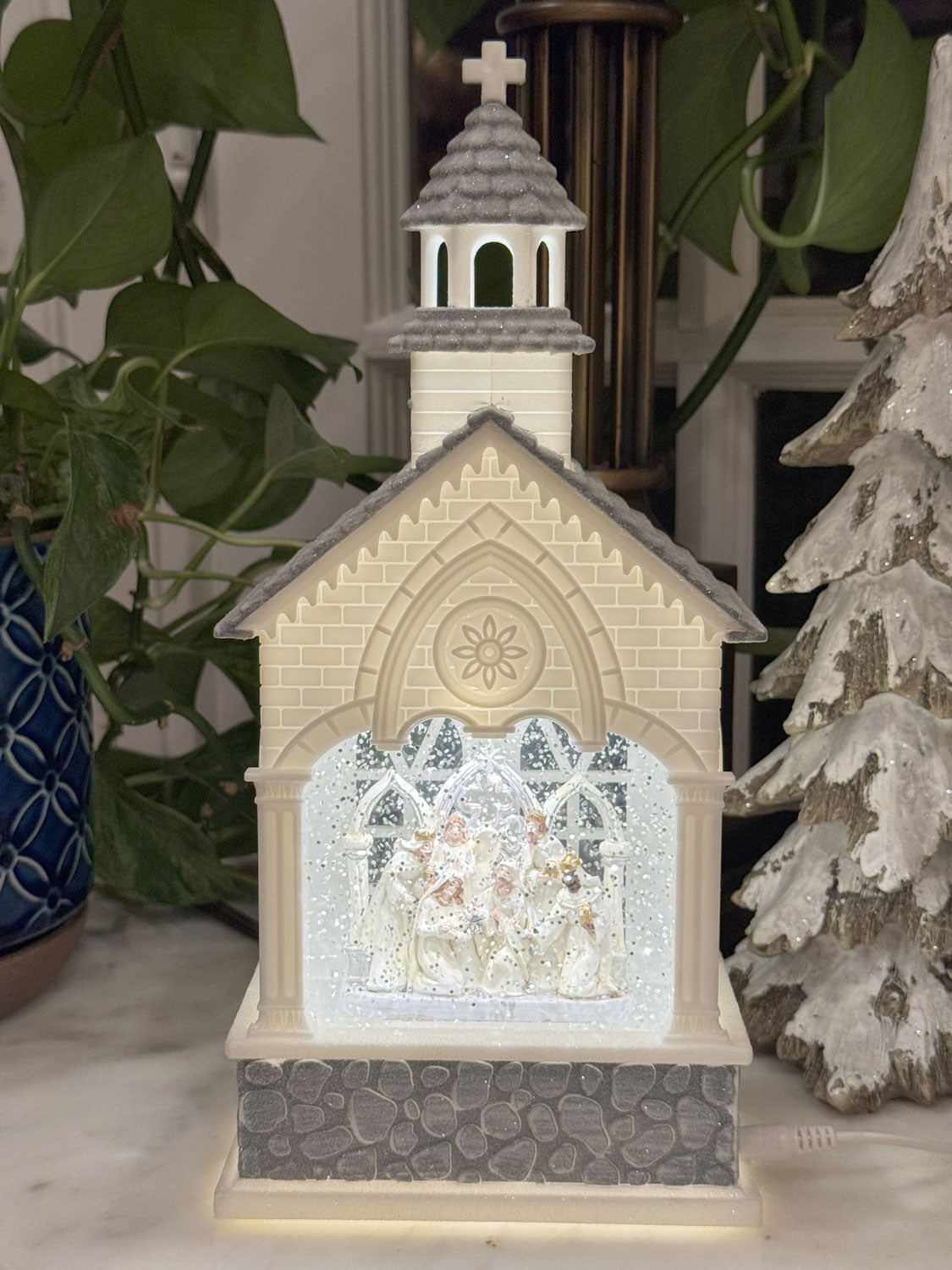 Enhance your holiday decor with our 12 Inch Nativity In Church Musical Water Lantern. Beautifully designed white church with a serene nativity scene inside, swirling silver glitter adds a touch of magic. Optional music setting plays a peaceful rendition of "Silent Night". USB included, new 2025.
