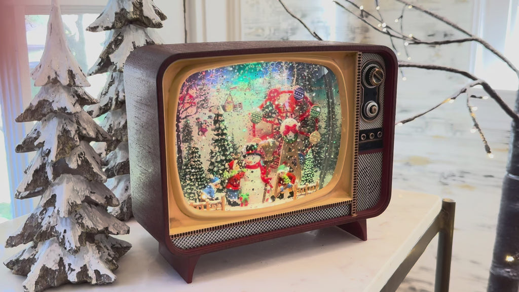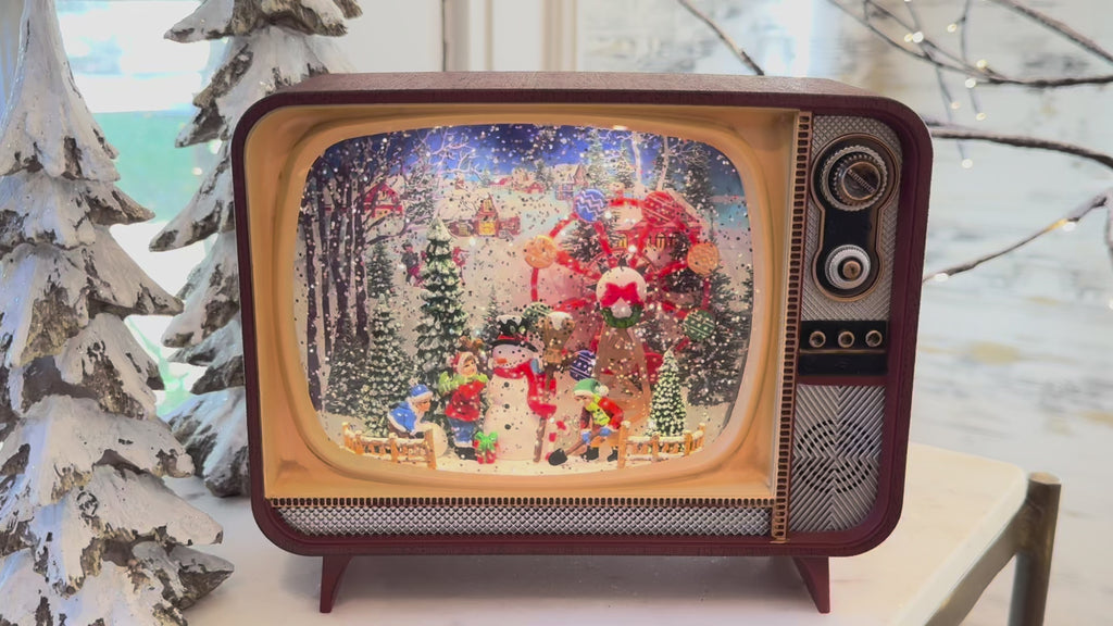 Get into the holiday spirit with our Ferris Wheel Snowman Scene Musical Lighted Water TV! Watch as the snowman and kids play around the rotating Ferris wheel. Enjoy 8 festive Christmas songs. A fun addition to any decor. (USB included for easy use, no hassle!)