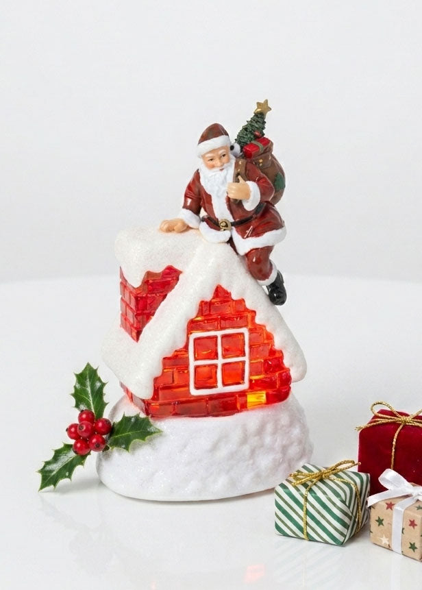 Part of our new Mini-Series, bring festive charm to any space with this enchanting miniature lighted water lantern. Standing 5.75 inches tall, this delightful Santa on Rooftop ready to shimmy down the chimney figurine rests on a white glitter base that swirls continuously when activated, creating a mesmerizing winter wonderland effect.