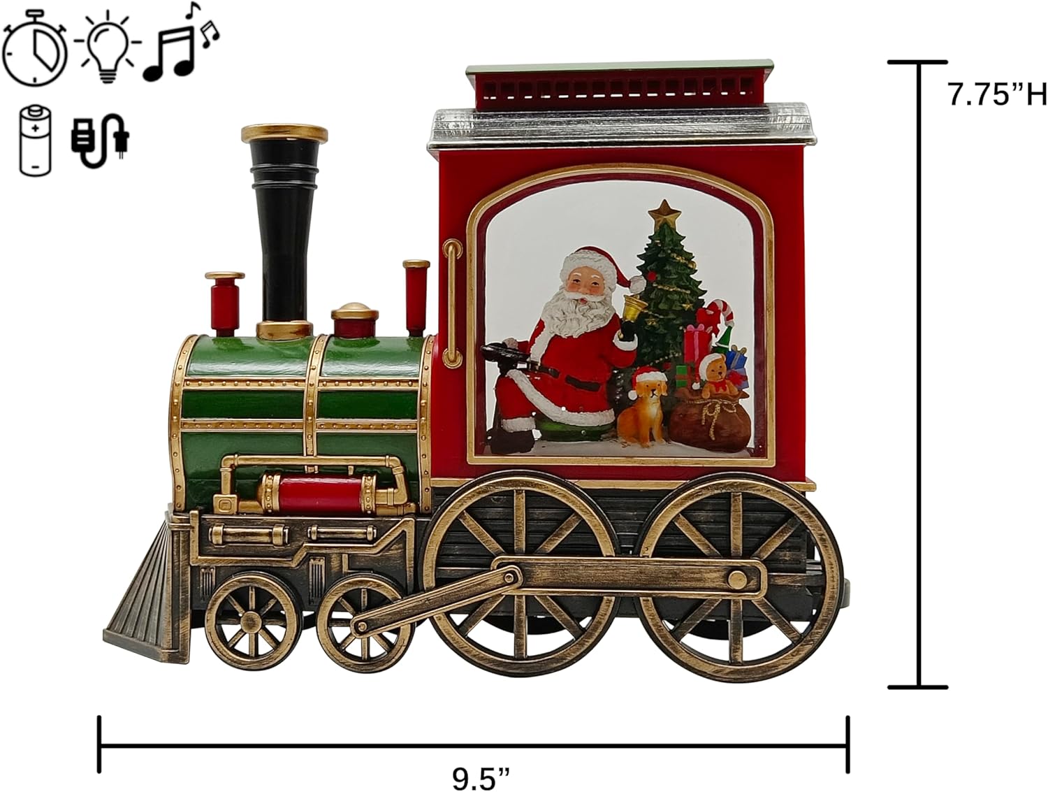 This exquisite 2025 edition Musical Santa With Gifts Lighted Water Train features finely detailed craftsmanship with Santa, his pup, and festive gifts inside a charming water globe. It plays music to enhance your holiday ambiance and offers dual power options: a convenient USB cord and battery operation for flexible placement. Perfect for adding classic holiday warmth and joy to any room.