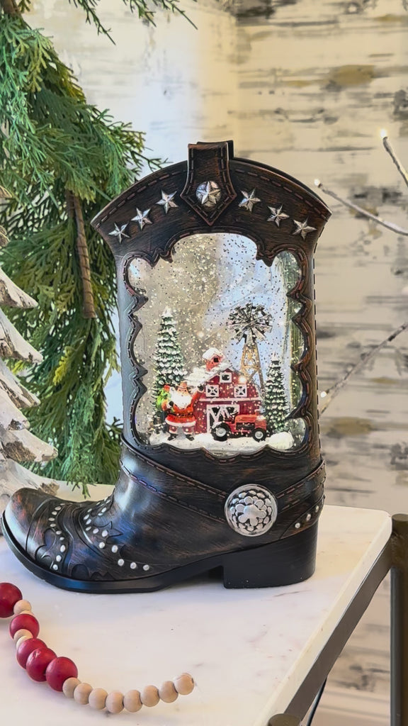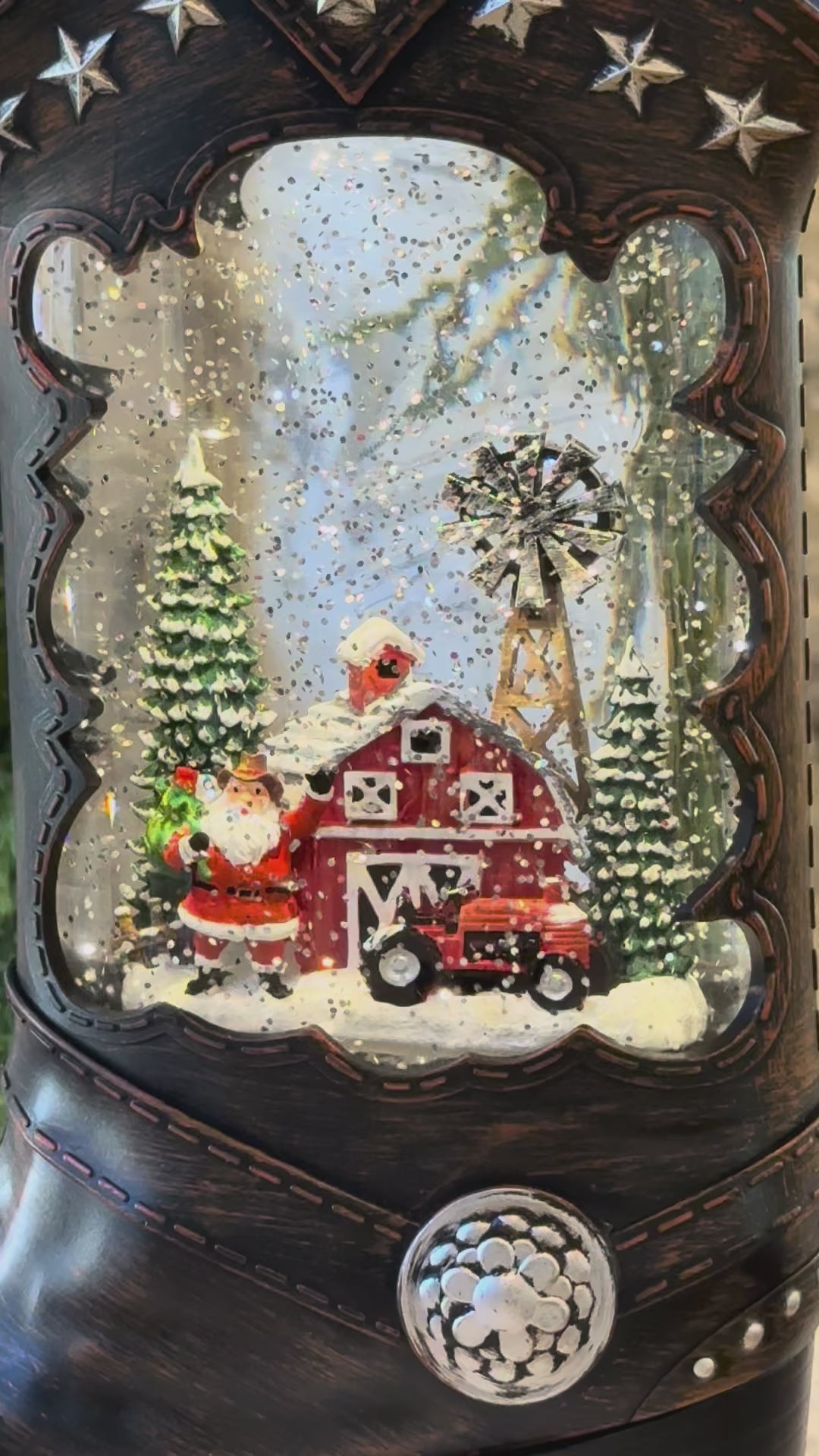 The Western Boot Lighted Water Lantern features a playful Santa farm scene with a barn and tractor inside a charming boot design. Swirling glitter adds a magical touch, while the included USB cord ensures easy use. New for 2025, this lantern brings festive fun with a unique western flair.