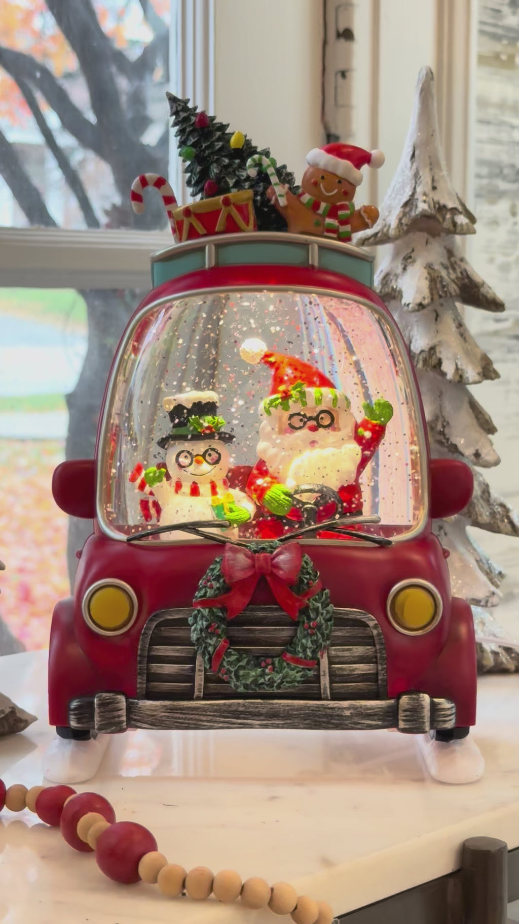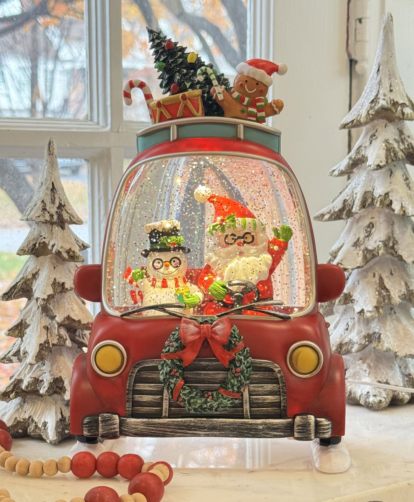 The Holly-Day Friends Lighted Water Car Lantern features Santa and Frosty wearing glasses, delivering gifts in style atop a festive red car. USB-powered and new for 2025, this playful lantern brings holiday fun and cheer to your seasonal decor.