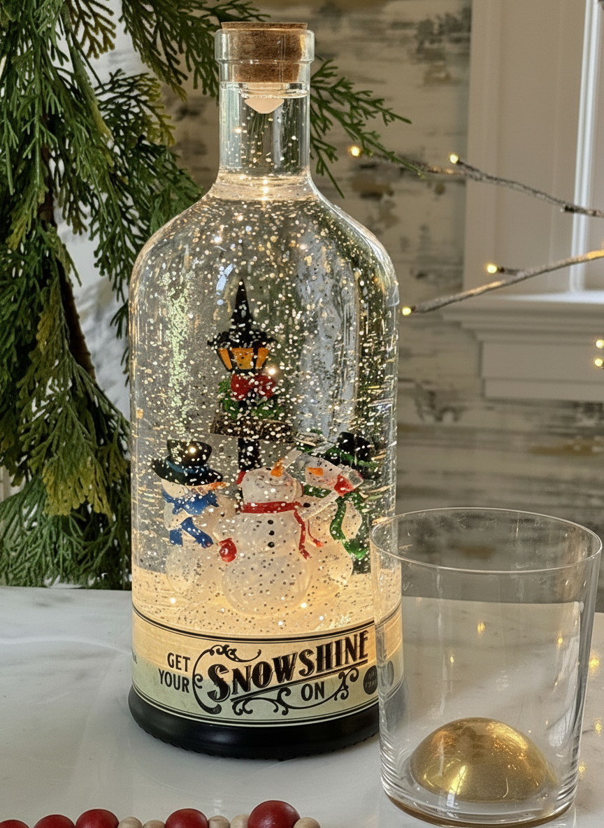 Get in the winter spirit with our Lighted Moonshine Snowmen Scene Bottle! This unique water lantern features 3 playful snowmen with hats and scarves gathered around a lamp post. The swirling glitter adds a touch of magic to the scene. Comes with a USB cord and topped with a cork, it's the perfect addition to your holiday decor.