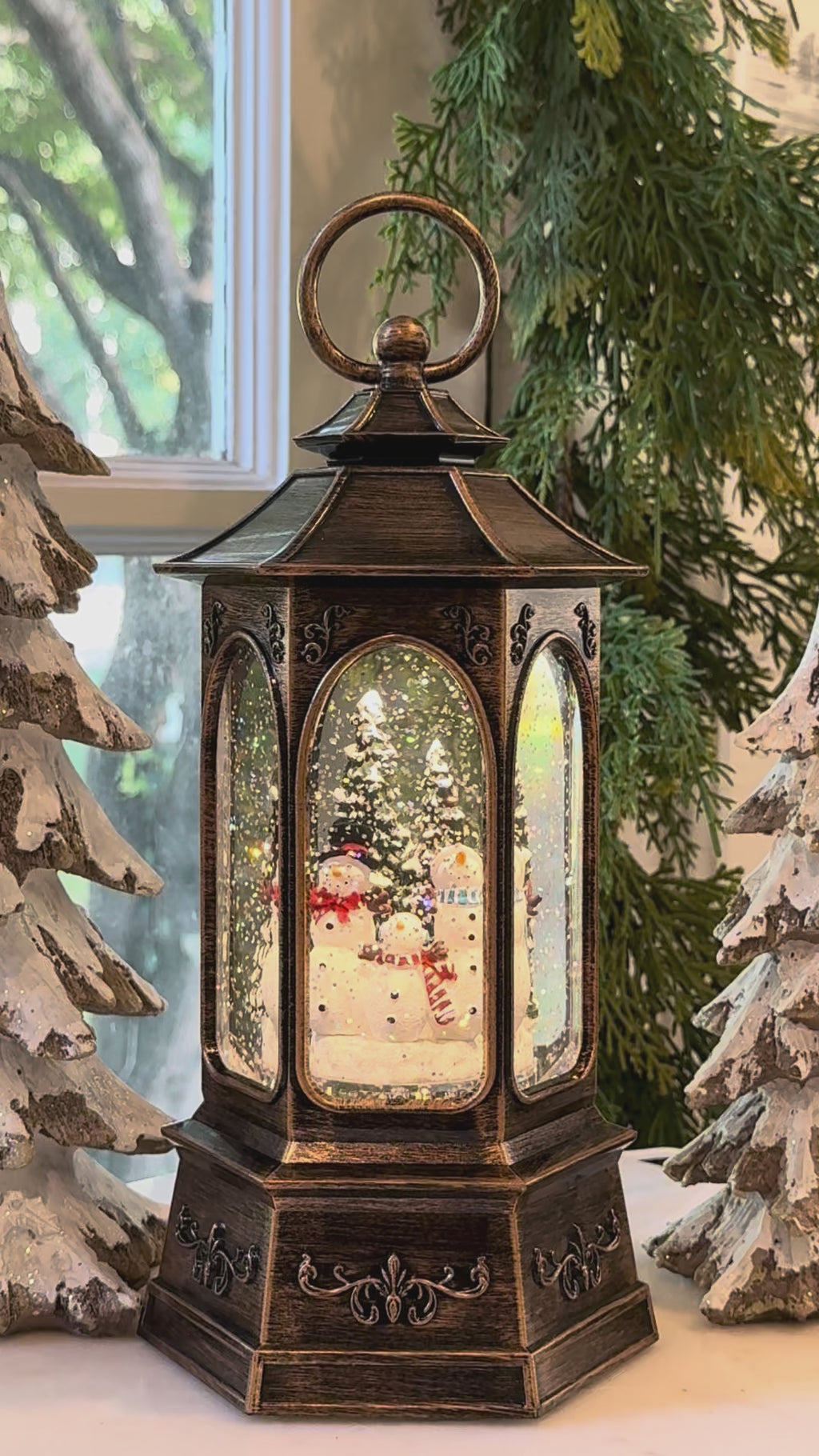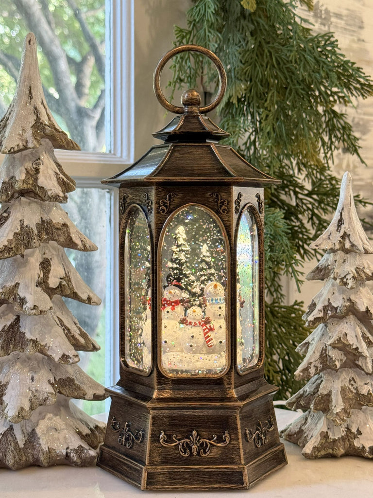 Celebrate the season with this playful water lantern featuring three snowmen dressed in cozy scarves and hats. Designed with six large windows for a full 360-degree view, it brings festive charm from every angle. New for 2025, it can be powered by batteries or the included USB cord, making it a delightful favorite for your holiday décor.