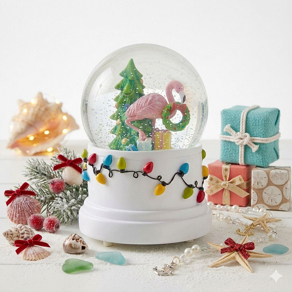 Bring festive charm to your home with this enchanting Flamingo Water Globe featuring swirling glitter and twinkling string lights. This 2026 collection piece combines a whimsical pink flamingo with a decorated tree and wreath, perfect for holiday displays or year-round decor. The continuous swirling glitter creates mesmerizing movement, it's versatile for any space. An ideal gift for flamingo lovers and décor enthusiasts alike, this traditional-style water globe adds a touch of whimsy and warmth to any room.