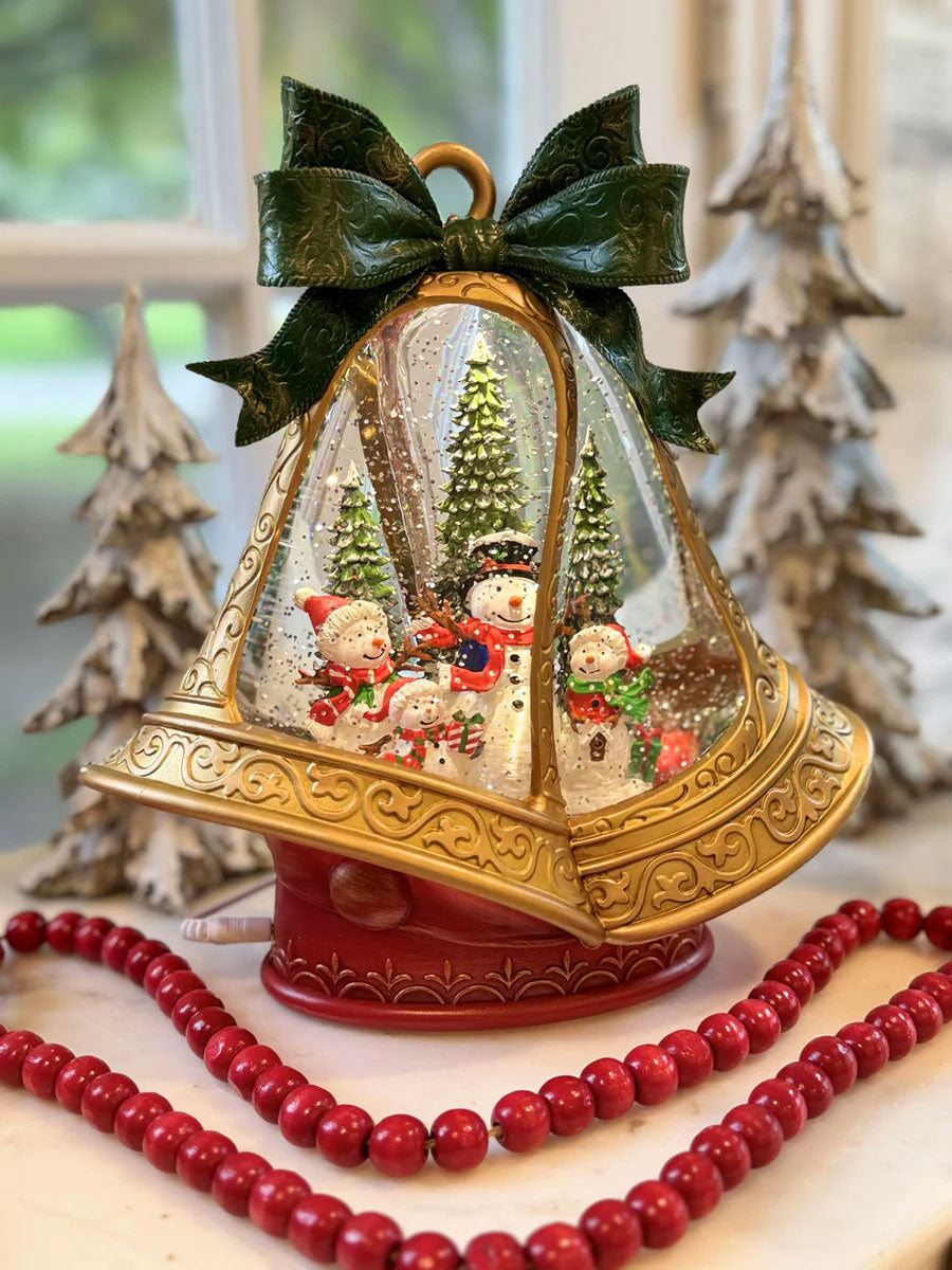Celebrate the season with this 10.25-inch tall bell-shaped lantern featuring a charming snowman scene. Adorned with a festive green bow, this lighted spinning water globe adds a playful and colorful glow to your holiday decorations.