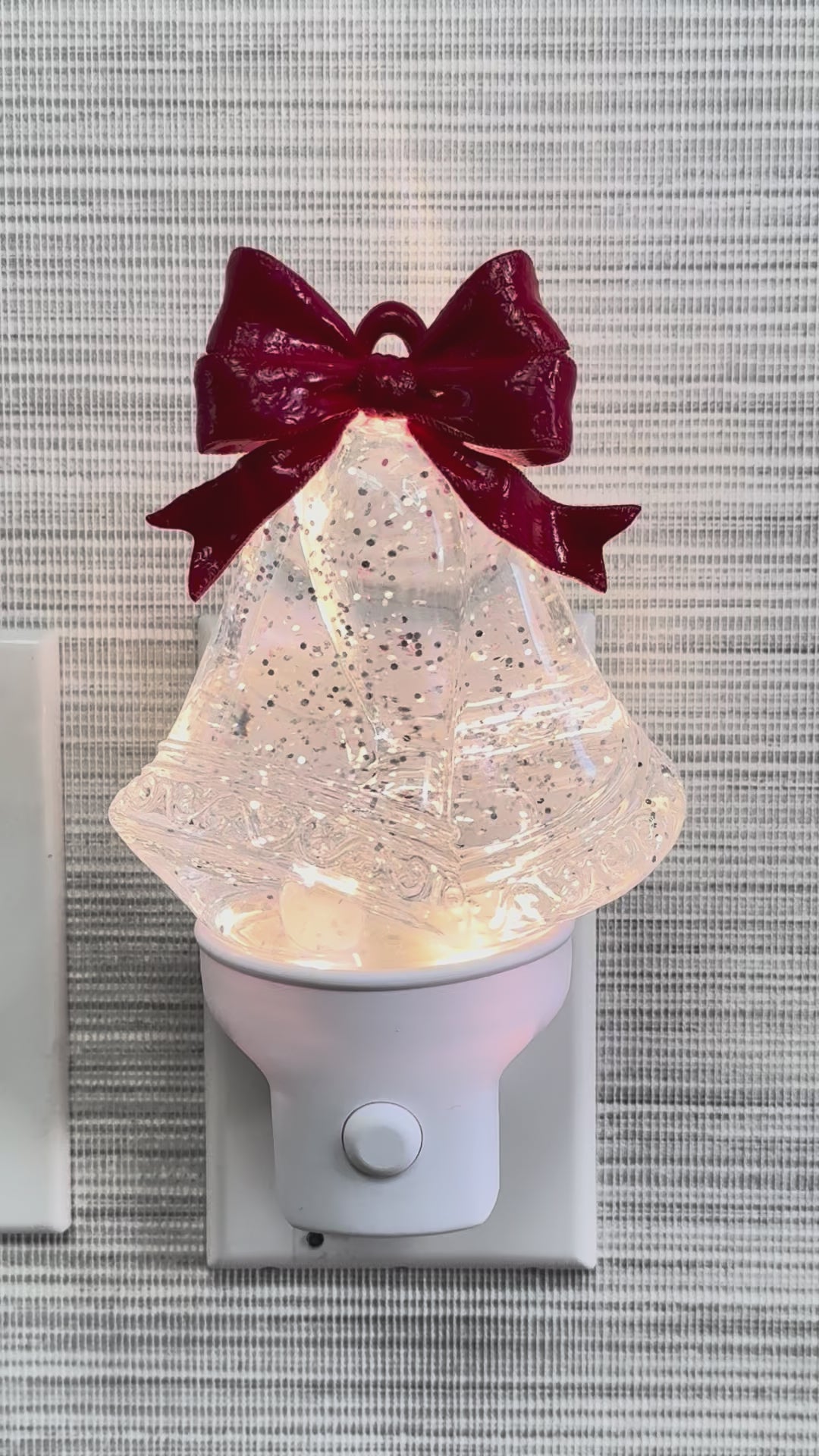Ring in the season with this cheerful plug-in water globe nightlight featuring festive bells crowned with a vibrant red bow. Watch mesmerizing glitter dance and swirl around this iconic holiday symbol, creating an enchanting glow in any room. Perfect for extending your seasonal décor well into January, this playful accent light brings warmth and wonder to bedrooms, bathrooms, or living spaces. The gentle illumination makes it ideal for nighttime comfort while keeping that magical holiday feeling alive. A delightful way to celebrate the joy of the season with sparkle and charm.